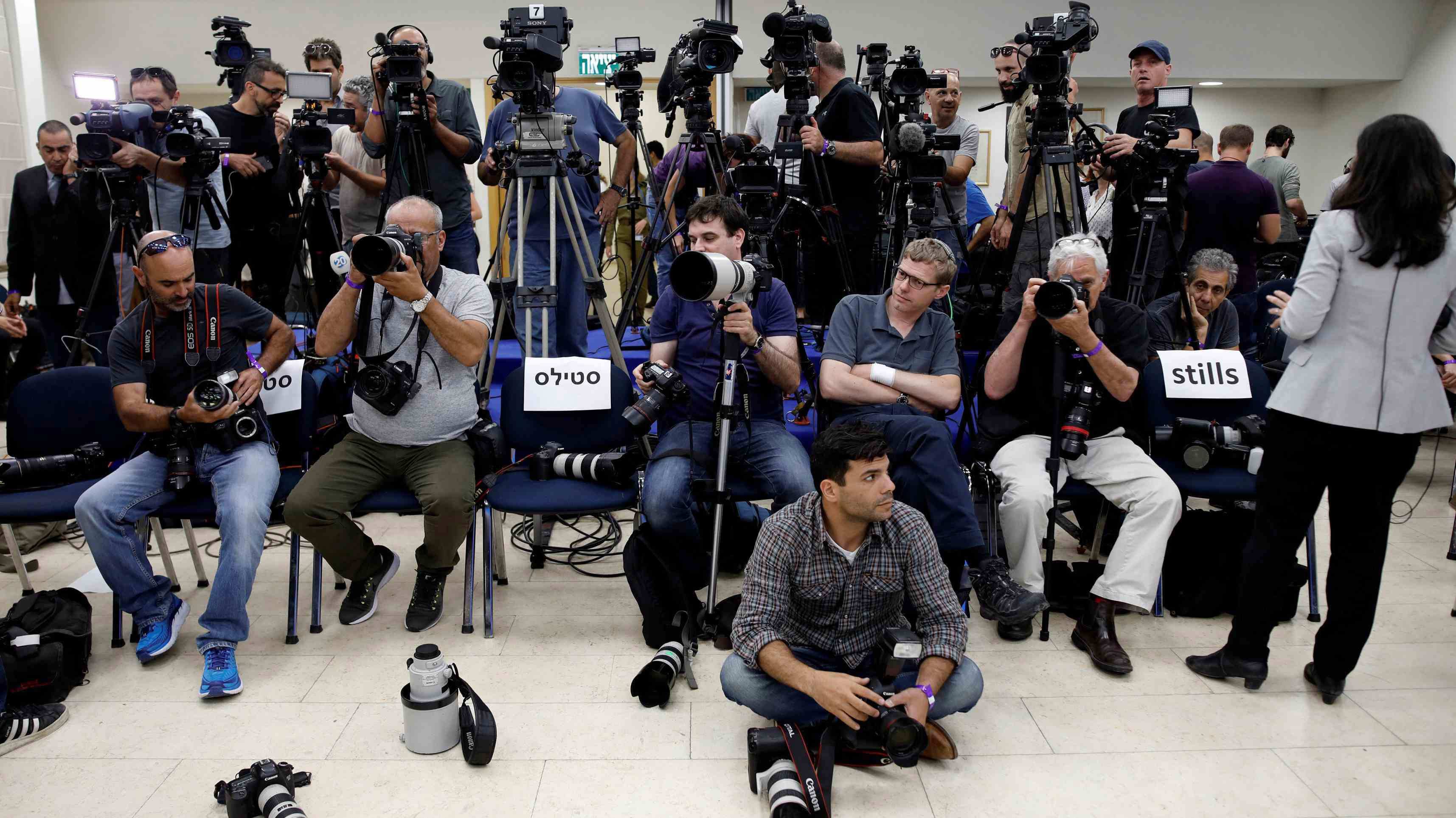 Media crews prepare themselves for a news conference by Israeli Prime Minister Benjamin Netanyahu in Tel Aviv, Israel, April 30, 2018. /Reuters Photo