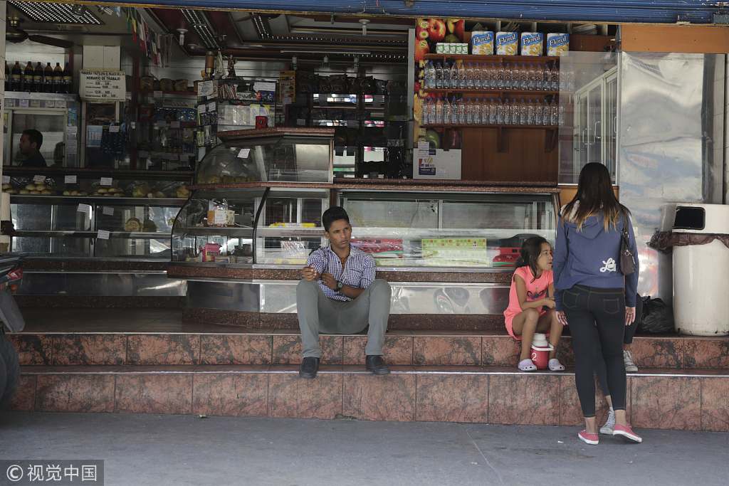 People sit in front of a bakery during a power outage that affects Caracas, March 25, 2019. /VCG Photo