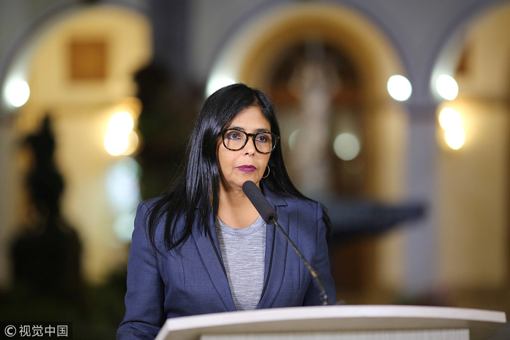 Venezuela's Vice President Delcy Rodriguez takes part in a broadcast, saying the blackout was caused by U.S. cyber attack, at the Miraflores Palace in Caracas, March 25, 2019. /VCG Photo