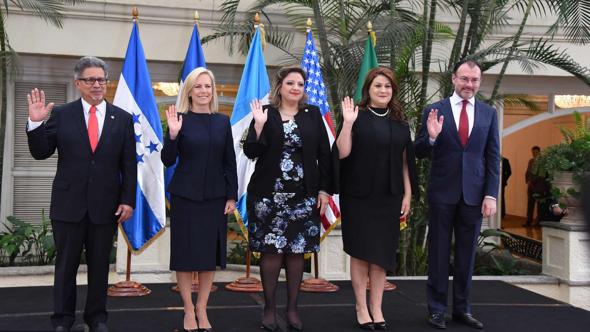 Salvadorean Foreign Minister Carlos Castaneda, US Homeland Security Secretary Kirstjen Nielsen, Guatemalan Foreign Minister Sandra Joviel, Honduran Secretary of Foreign Affairs Maria Aguero and Mexican Secretary of Foreign Affairs Luis Videgaray wave as they pose for a family photo in Guatemala City, July 10, 2018. /VCG Photo