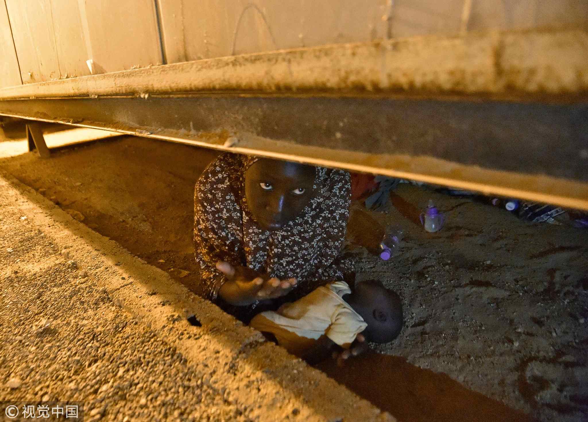 An African migrant from Niger hides with her newborn child under a structure as she tries to avoid deportation at a transit center for migrants in Tamanrasset in southern Algeria, July 2, 2018. /VCG Photo
