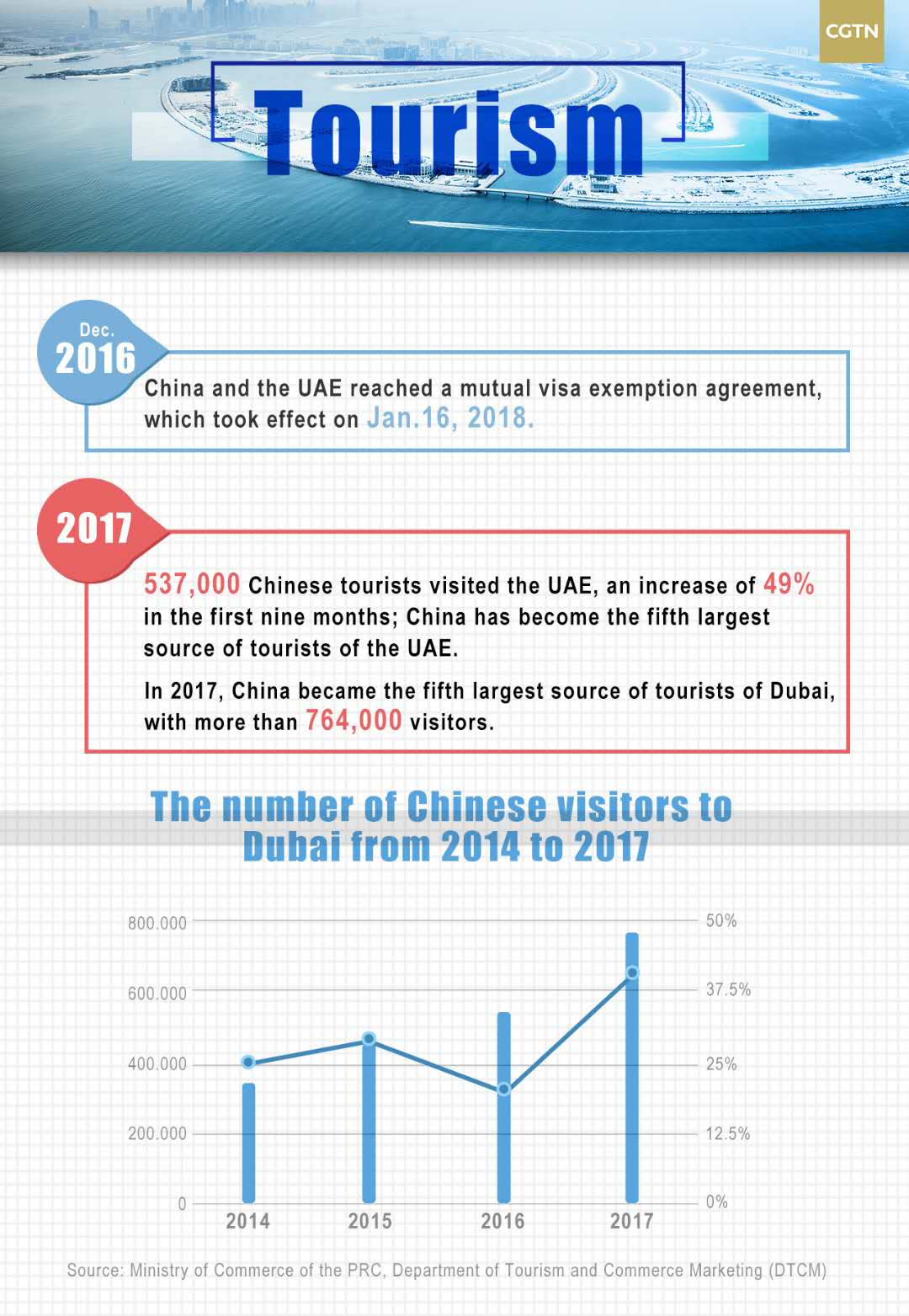 In 2017, Chinese visitors to the UAE exceeded one million. In the first quarter of 2017, 1,600 UAE tourists visited the Chinese mainland, a year-on-year increase of 4.6 percent. At the same time, 230,000 Chinese visited Dubai, a year-on-year increase of 64 percent. In January 2018, the UAE became the 11th country to implement mutual visa exemption with China.
