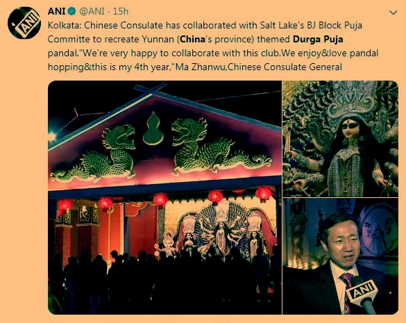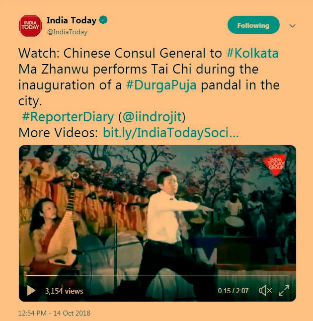 The India Today Group released a video of Ma Zhanwu, China's Consul General in Kolkata, performing intricate Tai Chi martial arts moves to the tune of 'Pipa' – a Chinese stringed musical instrument – played by his wife Yang Li at the inauguration of a Chinese-themed Durga Puja marquee in Kolkata's Salt Lake neighborhood.