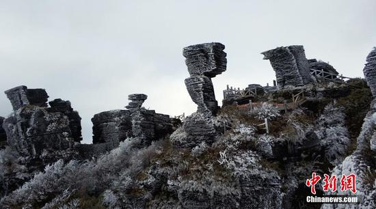 Famous mushroom-shaped stones in Fanjing Mountain, Guizhou Province. /ECNS Photo