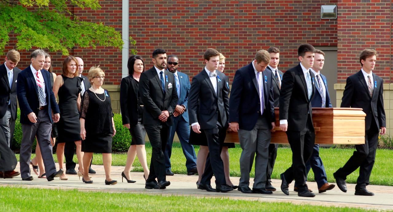 Fred and Cindy Warmbier follow the casket of their son, Otto Warmbier, to the hearse after his funeral at Wyoming High School in Wyoming, Ohio, U.S., June 22, 2017. /Reuters Photo