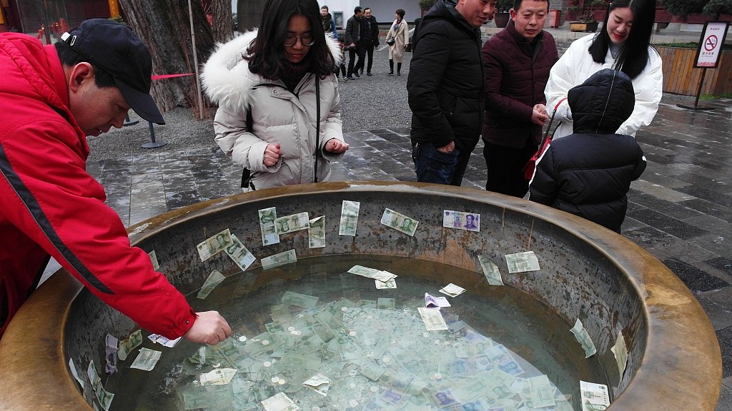 In a temple in Yichang City, central China's Hubei Province, people threw coins and banknotes into what it's called a treasure bowl in hopes to accumulate wealth in the new year. /VCG Photo