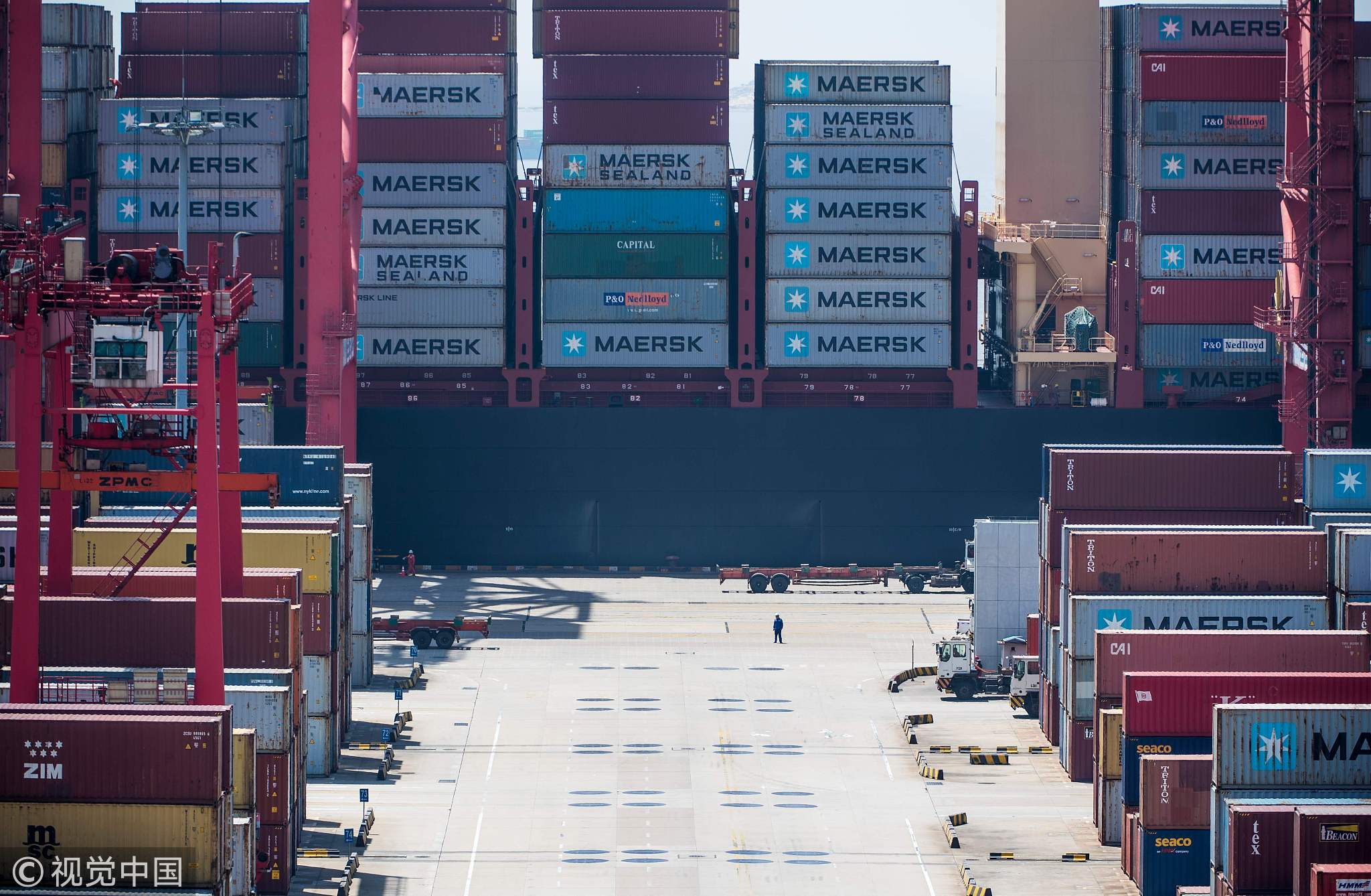April 9, 2018: A US cargo ship (back) is seen at the Yangshan Deep-Water Port, an automated cargo wharf, in Shanghai. /VCG Photo