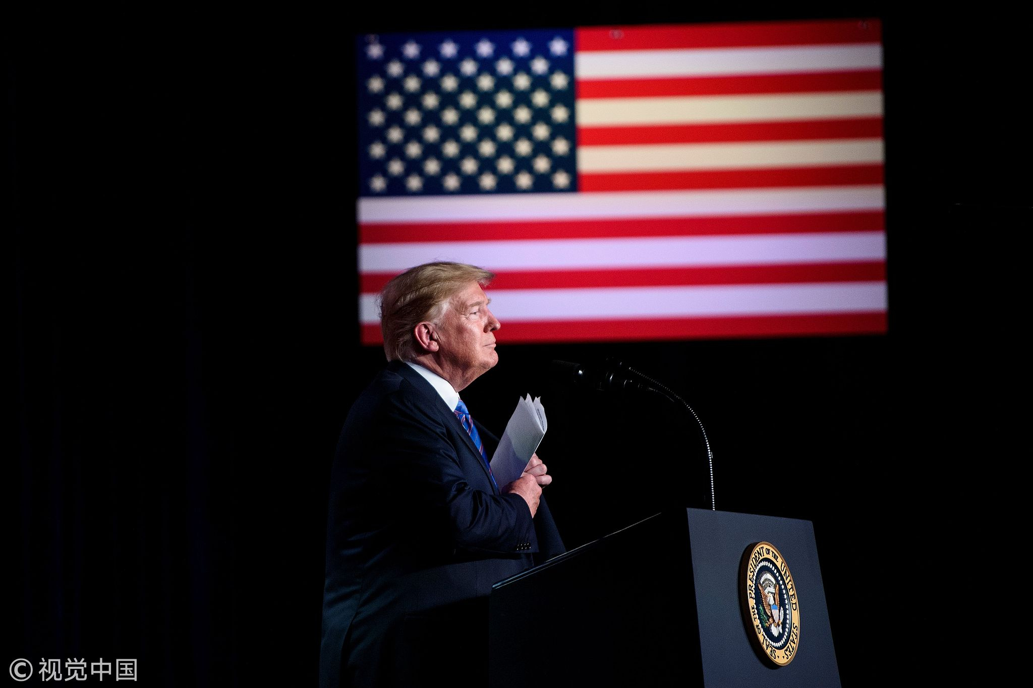 July 3, 2018: US President Donald Trump puts papers away after speaking during the Salute to Service dinner at the Greenbrier resort in White Sulphur Springs, West Virginia. /VCG Photo