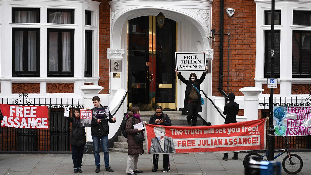 Supporters of WikiLeaks founder Julian Assange display banners and placards as they gather outside the Ecuadorian Embassy in London, April 5, 2019. /VCG Photo