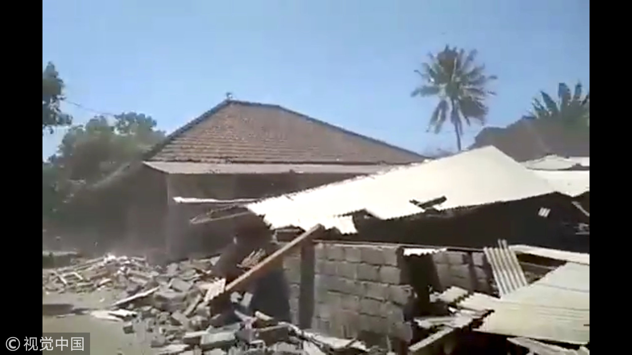 A still image from a video shows debris and dust after a building collapsed in the M6.3 earthquake in Lombok, Indonesia on August 19, 2018. /VCG Photo