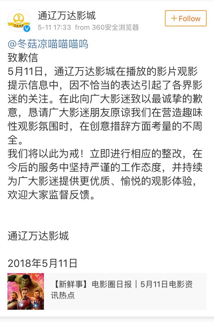 The statement posted on Weibo by Wanda Cinema in Tongliao, Inner Mongolia Autonomous Region /VCG Photo