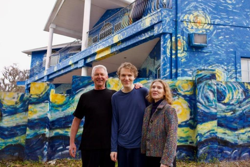 Lubomir Jastrzebski (L) and Nancy Nembhauser (R) pose with their son in front of the house with the "Starry Night" mural in Mount Dora, Florida. /Reuters Photo
