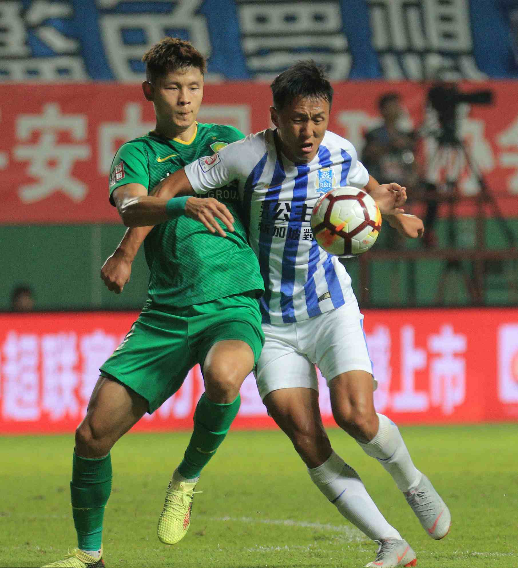 Players compete for the ball during the CSL match during which Beijing Guoan had a 3-0 win over Guangzhou R&F in Guangzhou, China, October 7, 2018. /VCG Photo