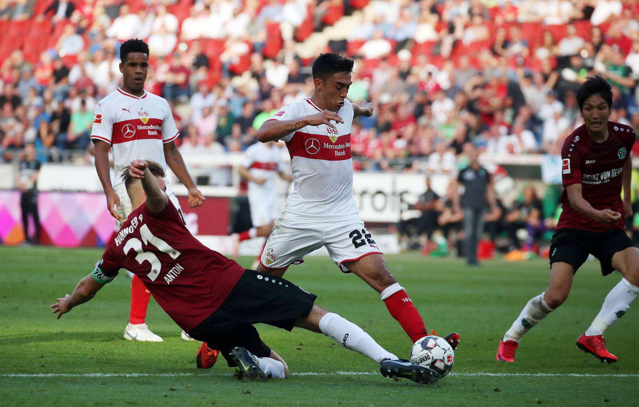 VfB Stuttgart striker Nicolas Gonzalez (C) passes the ball during the Bundesliga match between Hannover 96 and VfB Stuttgart in Hannover, Germany, October 6, 2018. /VCG Photo