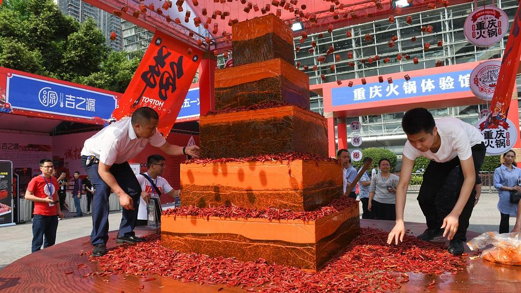 A flaming hot cake tower made entirely of hotpot condiments enthralls food lovers during an international food festival in southwest China's Chongqing Municipality on April 27, 2019. The five-tier cake weighs 600 kilograms and stands 1.5 meters tall. /VCG Photo