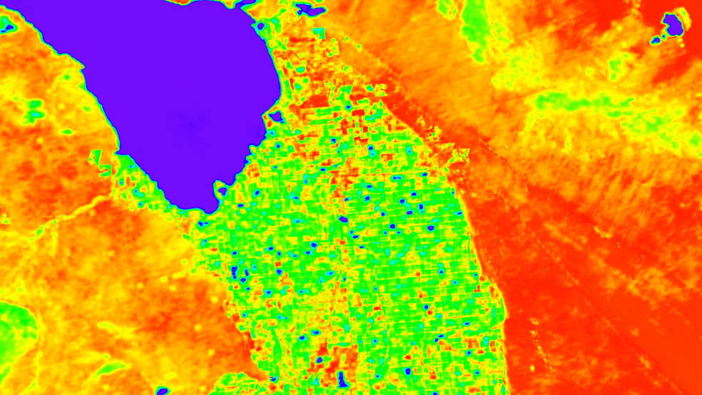 A simulation of ECOSTRESS land surface temperature data around California’s Salton Sea (dark blue area, upper left), and cooler areas appear in blue and green, warmer areas in yellow and red. /NASA Photo