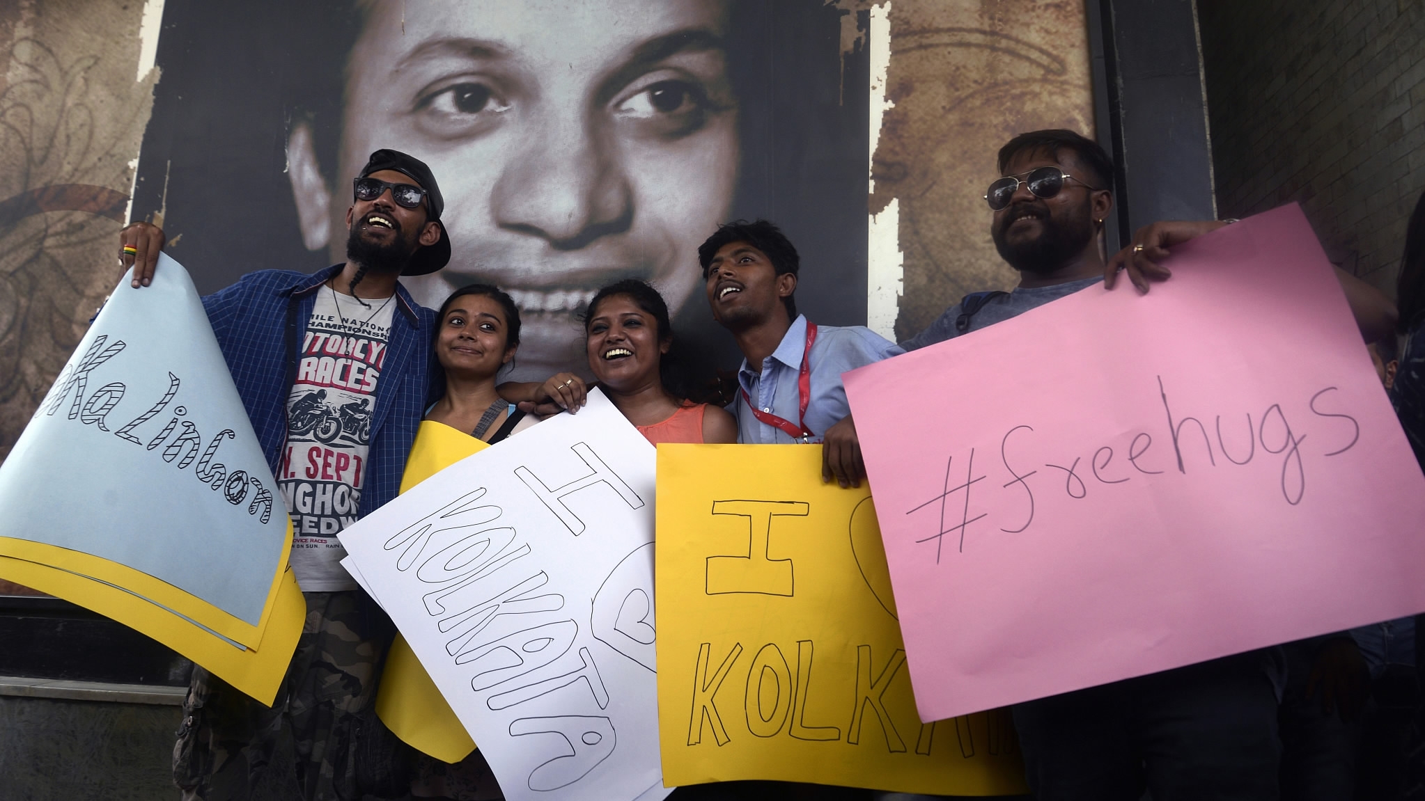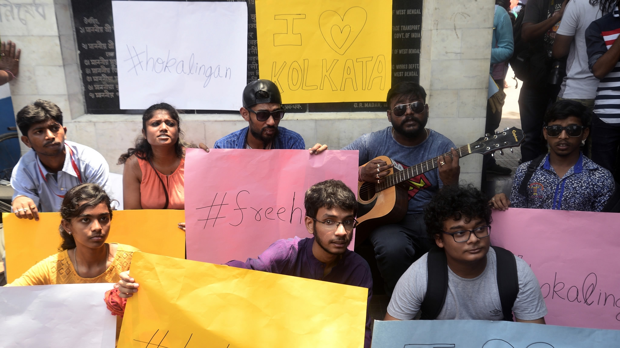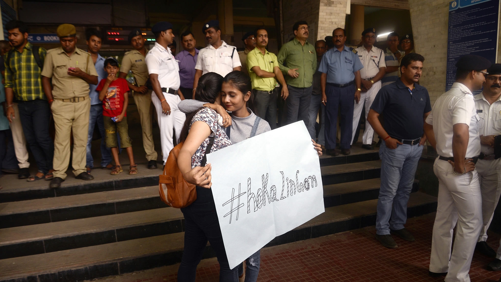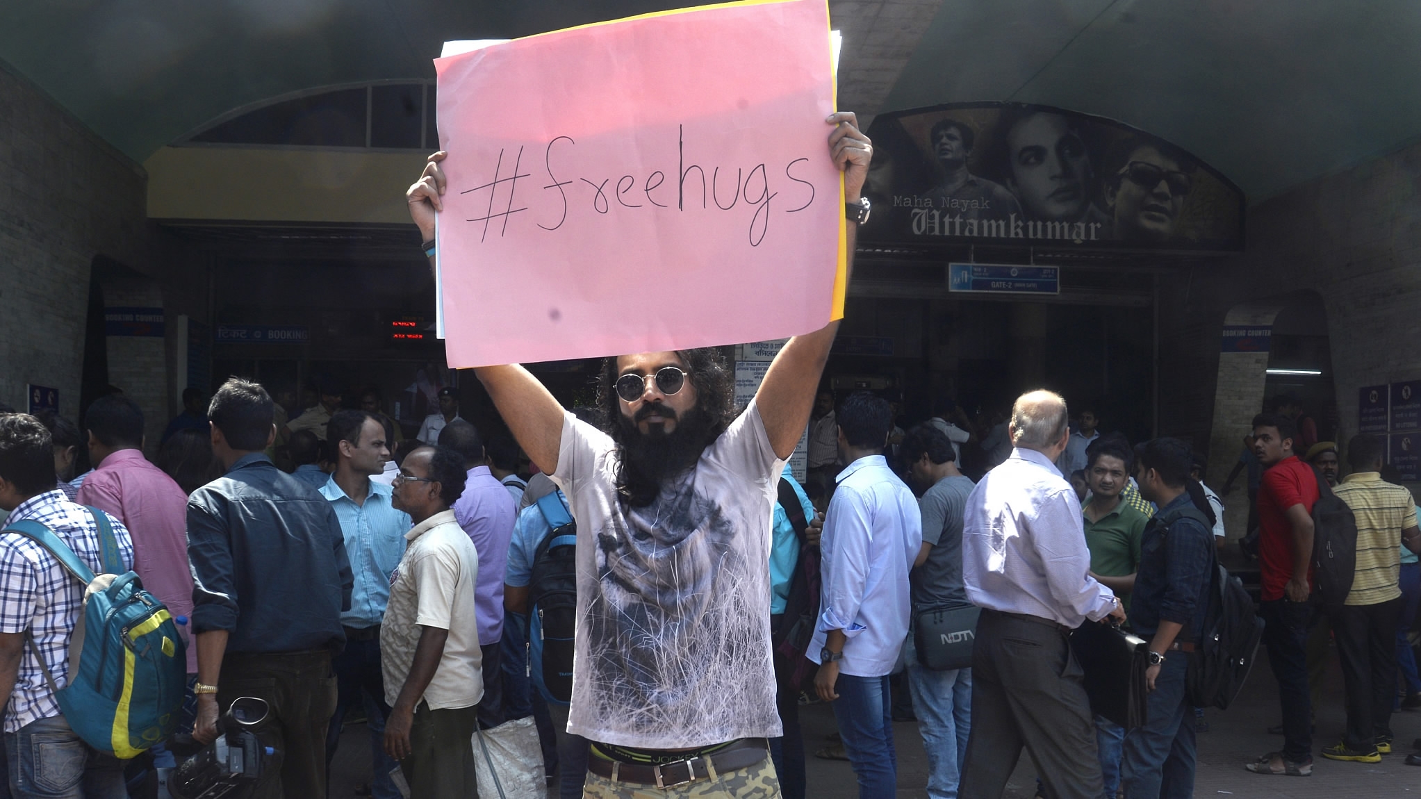 Activists hold a poster and hug each other during the protest in front of a metro station in Kolkata on Wednesday, backing up the harassed couple. /VCG Photo