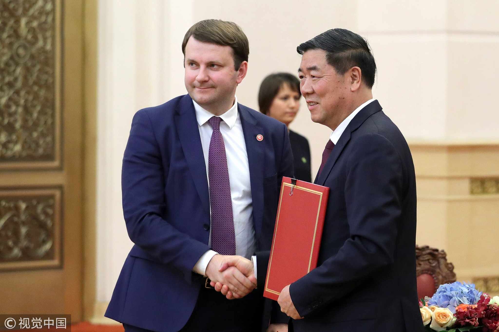 Russia's Economic Development Minister Maxim Oreshkin (L) and the Chairman of the Chinese National Development and Reform Commission, He Lifeng shake hands at a ceremony to sign joint documents following Russian-Chinese talks. June 8, 2018 /VCG Photo