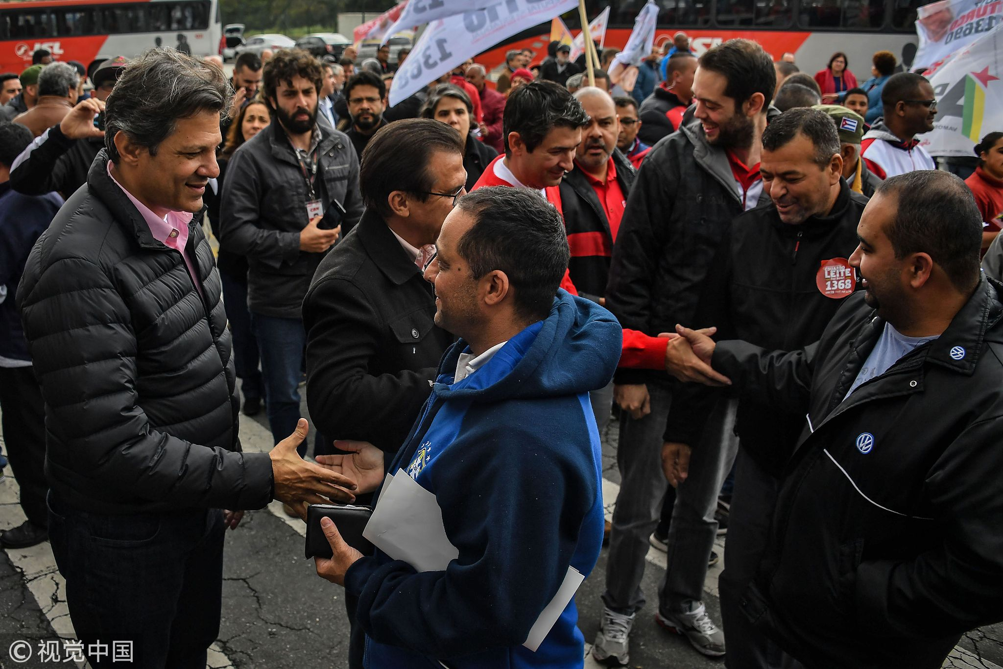 Brazilian presidential candidate for the Worker's Party (PT) Fernando Haddad (L), shakes hands with a supporter as he campaigns at the entrance of the Volkswagen plant in Sao Bernardo do Campo, September 5, 2018. /VCG Photo