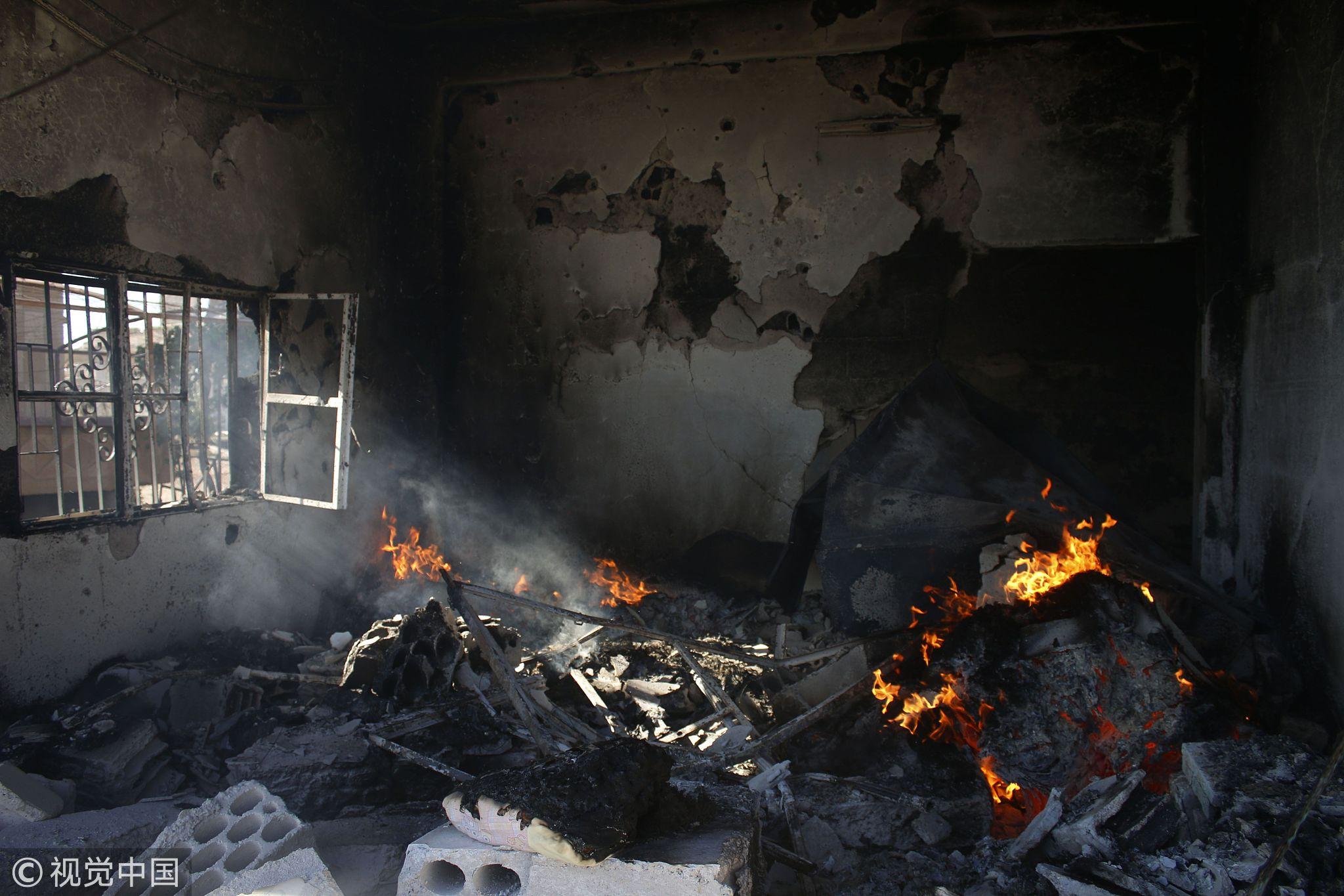 A house is set on fire during an airstrike by Syrian regime forces on the town of Busra al-Harir in the east of the southern Syrian province of Daraa, June 24, 2018. /VCG Photo