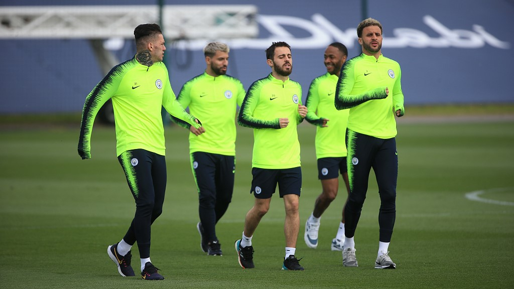 Players of Manchester City train before their game against Leicester City, May 6, 2019. /VCG Photo