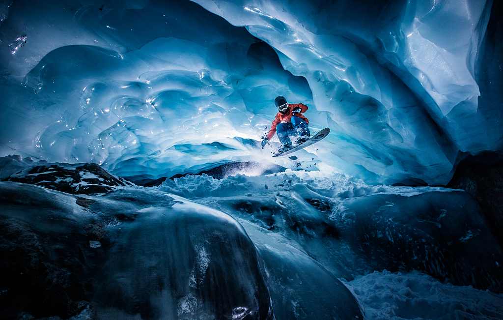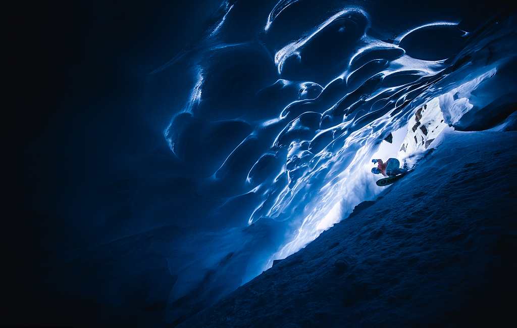 Photos capture a daredevil snowboarder speeding through a narrow ice tunnel for 40 meters in Tyrol, Australia. /Photo by Christoph Jorda, Solent News