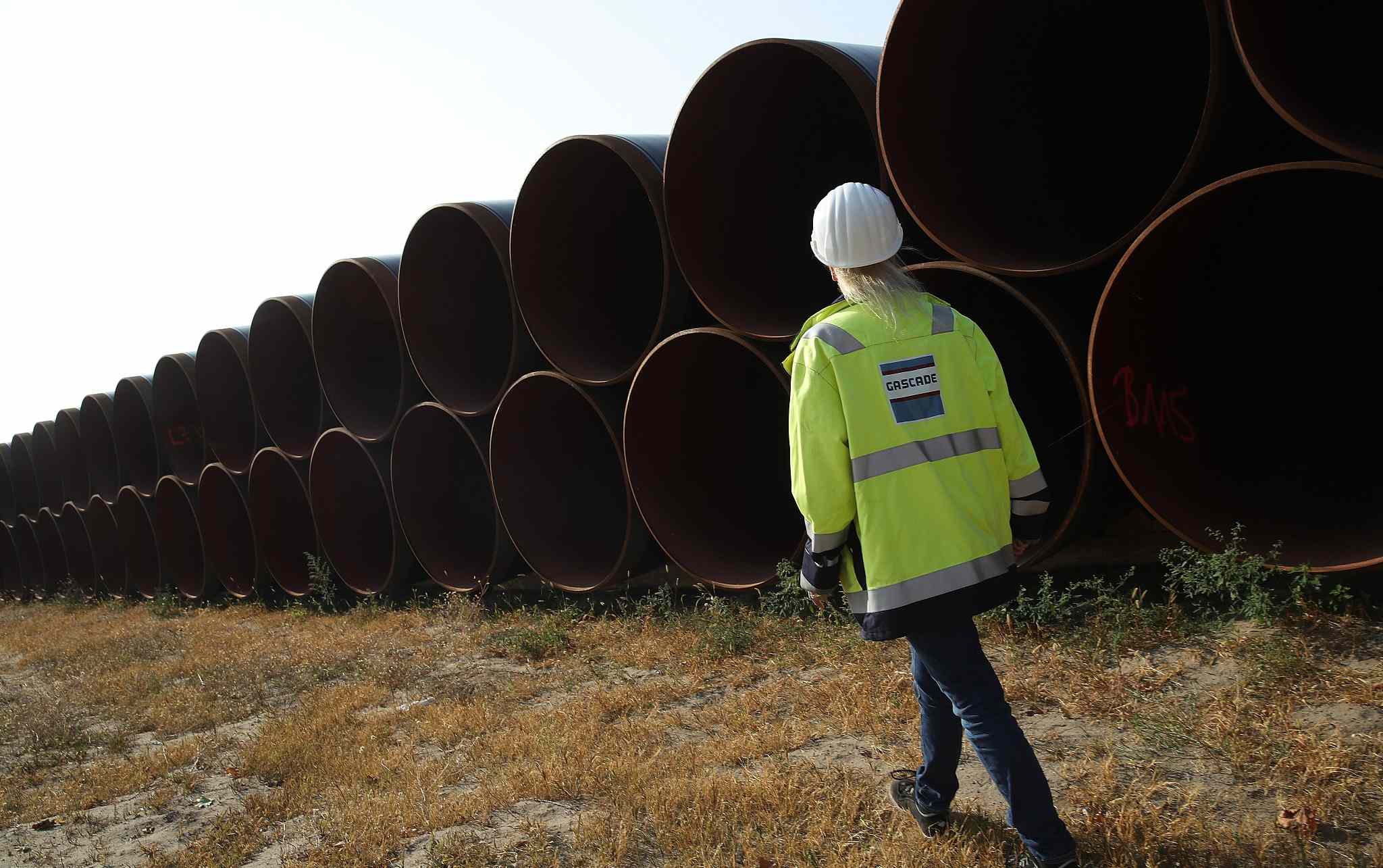 An employee of GASCADE Gastransport GmbH walks along sections of steel pipes at the construction site of the Eugal Natural Gas Pipeline near Golssen, Germany, August 29, 2018. /VCG Photo