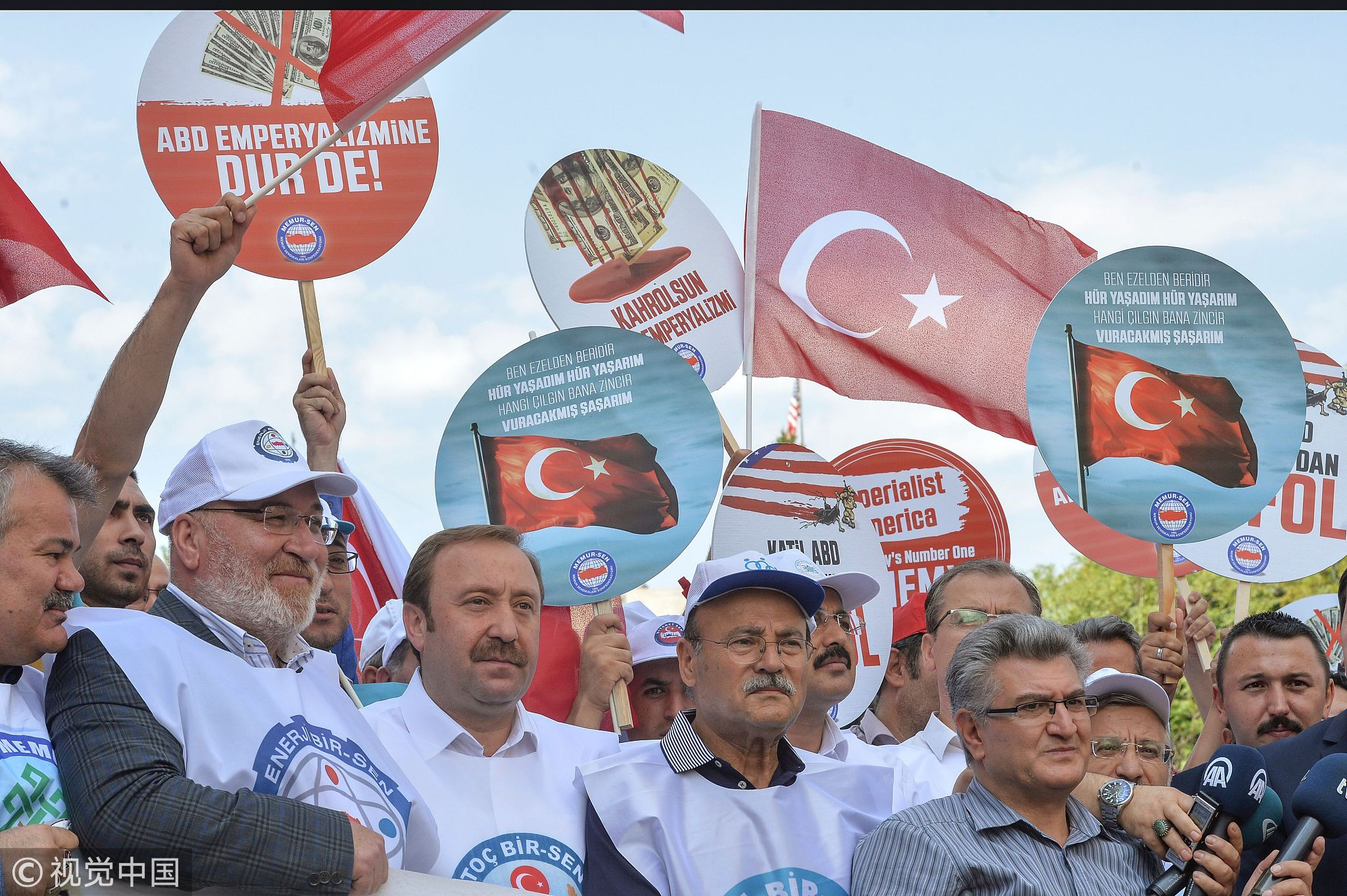 Protesters wave Turkish national flags and hold placards reading "US get out of Middle East" as they chant slogans against the US in front of the US embassy in Ankara, August 3, 2018 . /VCG Photo