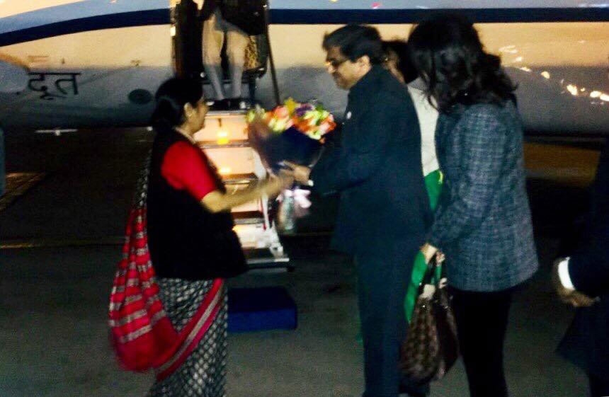 India's External Affairs Minister Sushma Swaraj (left) is greeted by the Indian Ambassador to China Gautam Bambawale ( center) upon her arrival in Beijing, April 21, 2018. /Photo via Embassy of India, Beijing