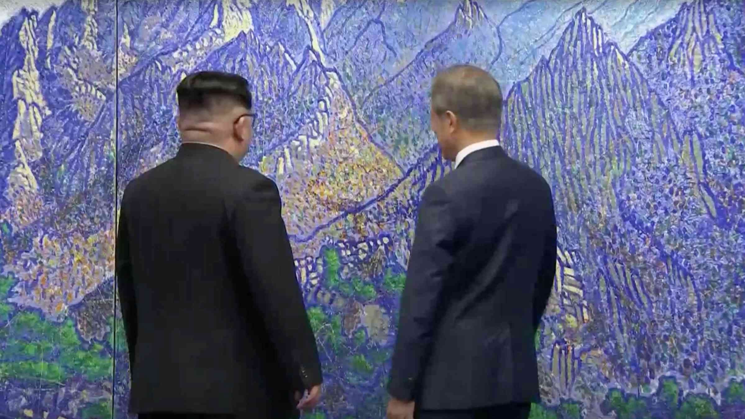 DPRK leader Kim Jong Un and ROK President Moon Jae-in look at a painting of Mount Kumgang at the truce village of Panmunjom, in this still frame taken from a video on April 27, 2018. /Reuters Photo