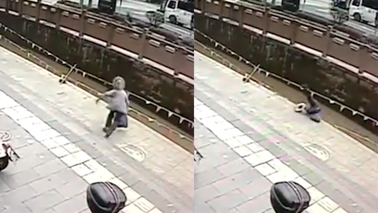 An old man tripped on the stairs and fell into a canal in Leshan City, southwest China’s Sichuan Province on Friday. Passersby immediately came to his rescue, pulling him out of the water.