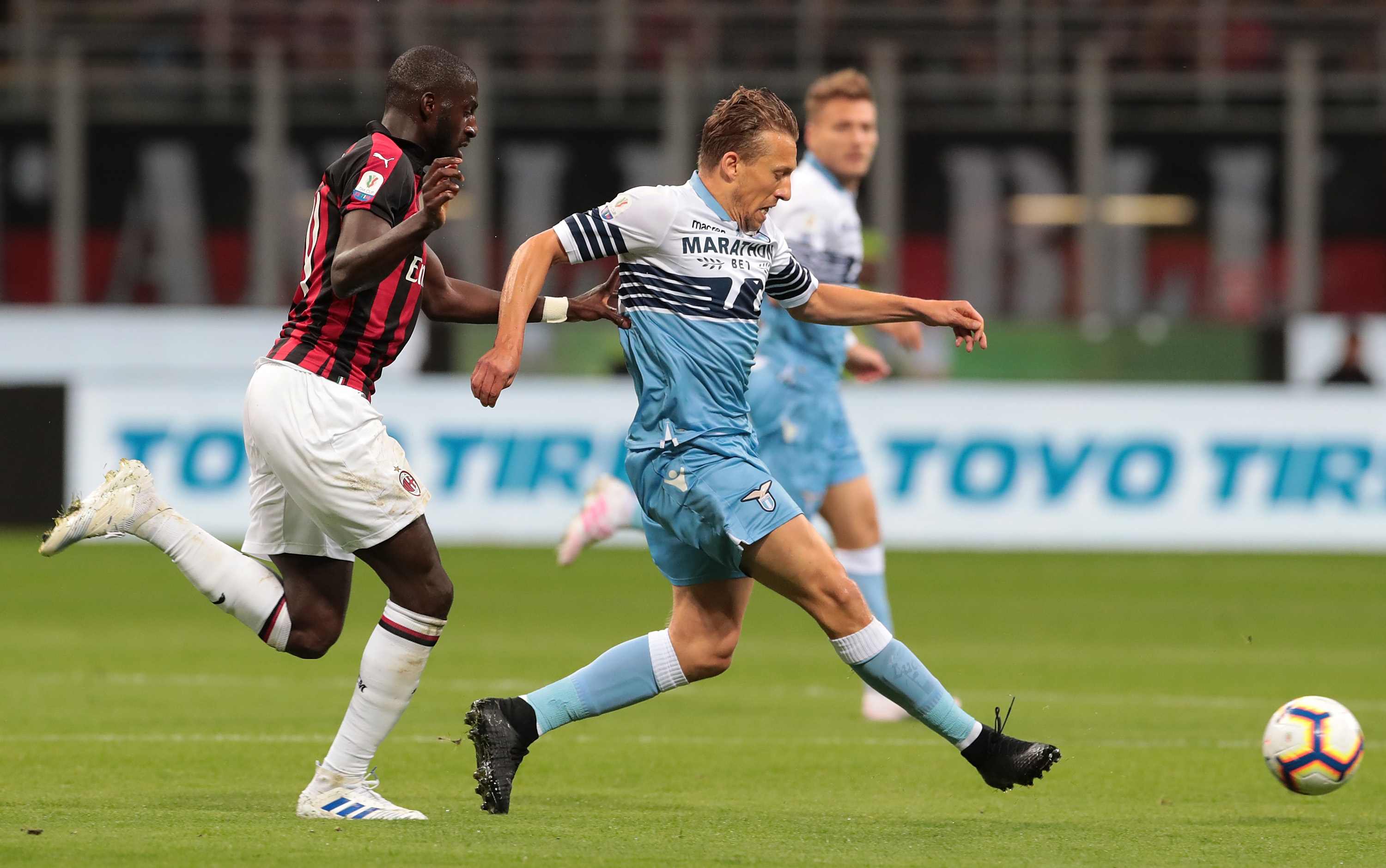 Lucas Leiva of Lazio (R) is challenged by Tiemoue Bakayoko of AC Milan (L) during the Italian cup semi-final in Milan, Italy, April 24, 2019. /VCG Photo