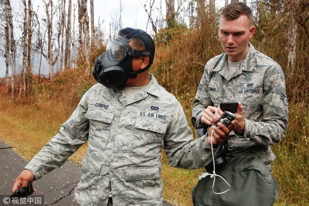 Senior airmen Orlando Corpuz (L), and John Linzmeier, of the Hawaii National Guard, monitor sulfur dioxide gas levels in Leilani Estates during the ongoing eruptions of the Kilauea Volcano in Hawaii, US, May 18, 2018. /Photo via VCG