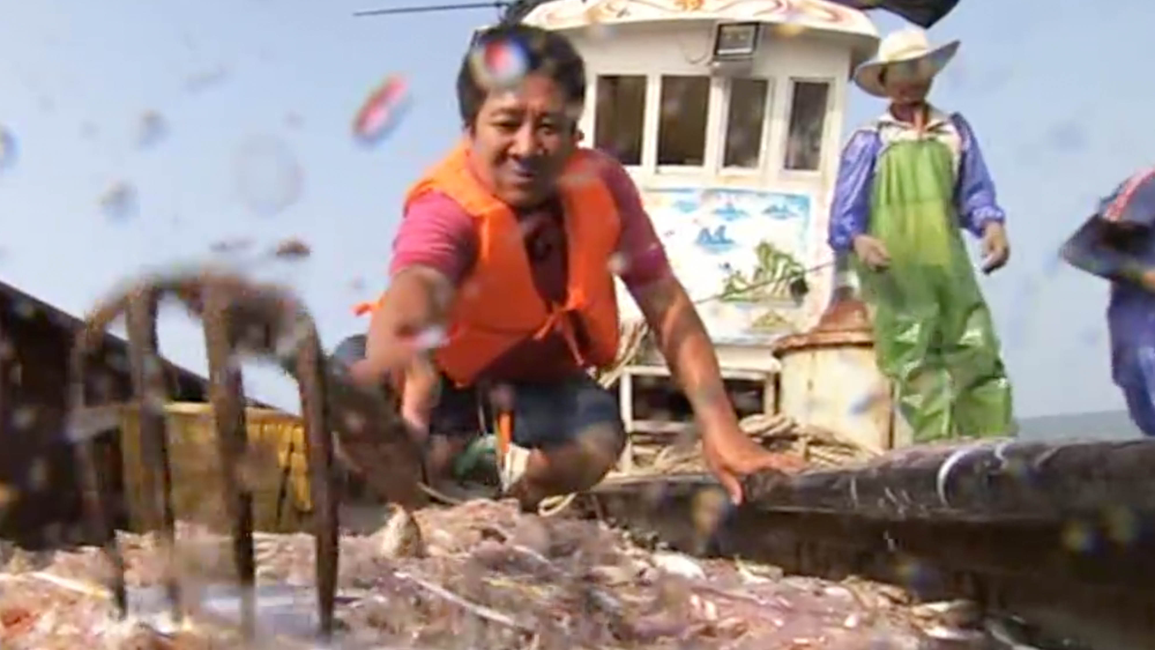 The ups and downs of the tide bring wild fish to the top of the water, but it takes back-breaking labor for fishermen like Wang to pull them onto the ship.