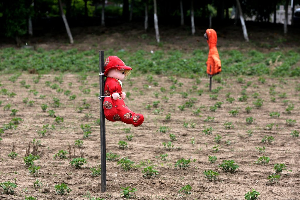Farmers in Huai’an, east China’s Jiangsu Province have invented ways, such as hanging dolls and clothes, to drive birds away. /VCG Photo