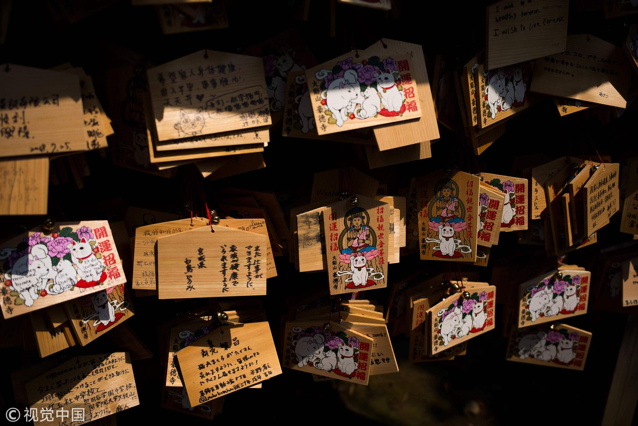 Wooden votive tables called "ema" with wishes and images of cats on them at the Gotokuji temple. /VCG Photo
