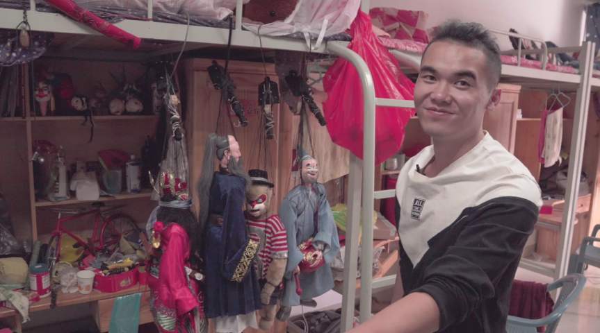 His collection of marionettes in the dormitory. ©CGTN | Daken Art