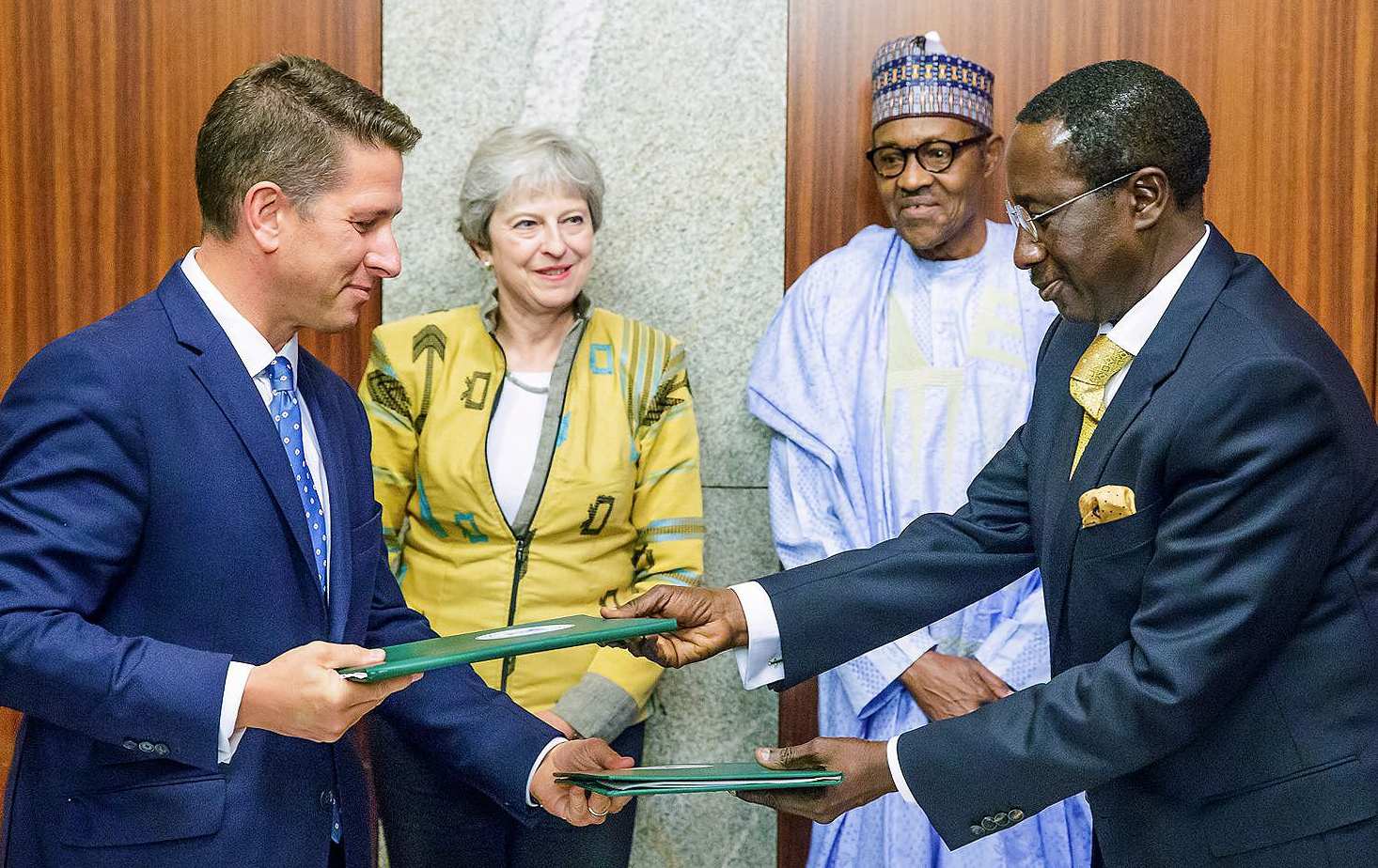 British Prime Minister Theresa May (back L) and Nigerian President Muhammadu Buhari (back R) watching as British Deputy National Security Adviser Christian Turner (front L) and Nigerian National Security Adviser Babagana Monguno exchange documents following the signing of bilateral agreements on Defense and Security Partnership in Abuja, August 29, 2018. /VCG Photo