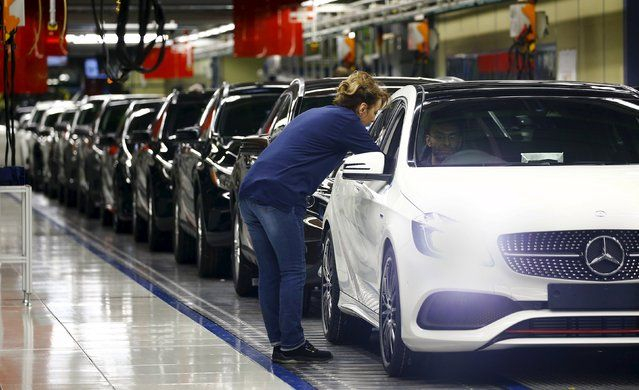 Employees of German car manufacturer Mercedes Benz make final adjustments at the end of the Mercedes A class (A-Klasse) production line at the factory in Rastatt, Germany, January 22, 2016. /Reuters Photo