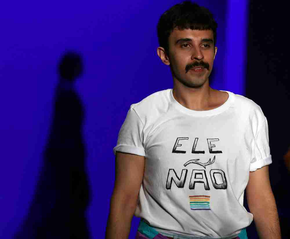 Brazilian designer Celio Dias wears a shirt that reads "Him not" in a protest against Brazil's presidential candidate Jair Bolsonaro during the Sao Paulo Fashion Week, October 23, 2018. /VCG Photo