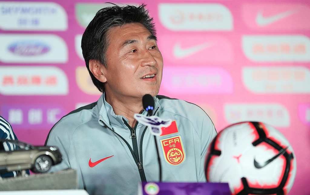 Jia Xiuquan, head coach of the China Women's National Football Team, briefs the media at the International Women's Football Tournament. /VCG Photo