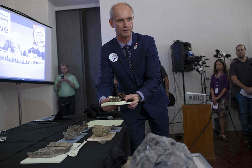 Director of Brazil's National Museum Alexander Kellner shows fossils found among the debris in the building, destroyed by a fire last year, during a press conference on the expo "When Not Everything Was Ice: New Discoveries in the Antarctic Continent," in Rio de Janeiro, Brazil, January 16, 2019. /VCG Photo