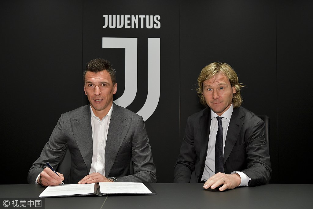Juventus forward Mario Mandzukic (L), with club's vice president Pavel Nedved, April 4, 2019. /VCG Photo