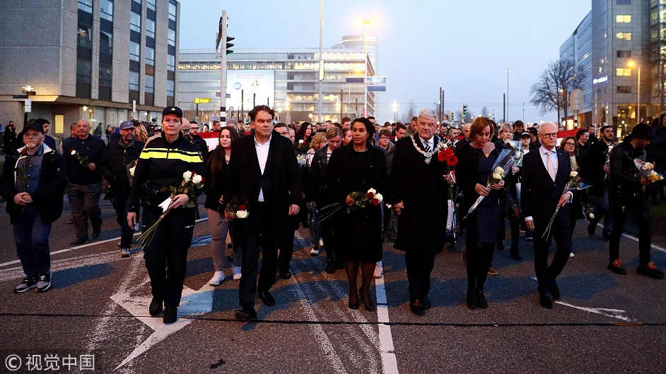 Utrecht Mayor Jan van Zanen (4th from left) takes part in a silent march to commemorate the victims of the March 18 attack in Utrecht, March 22, 2019. /VCG Photo
