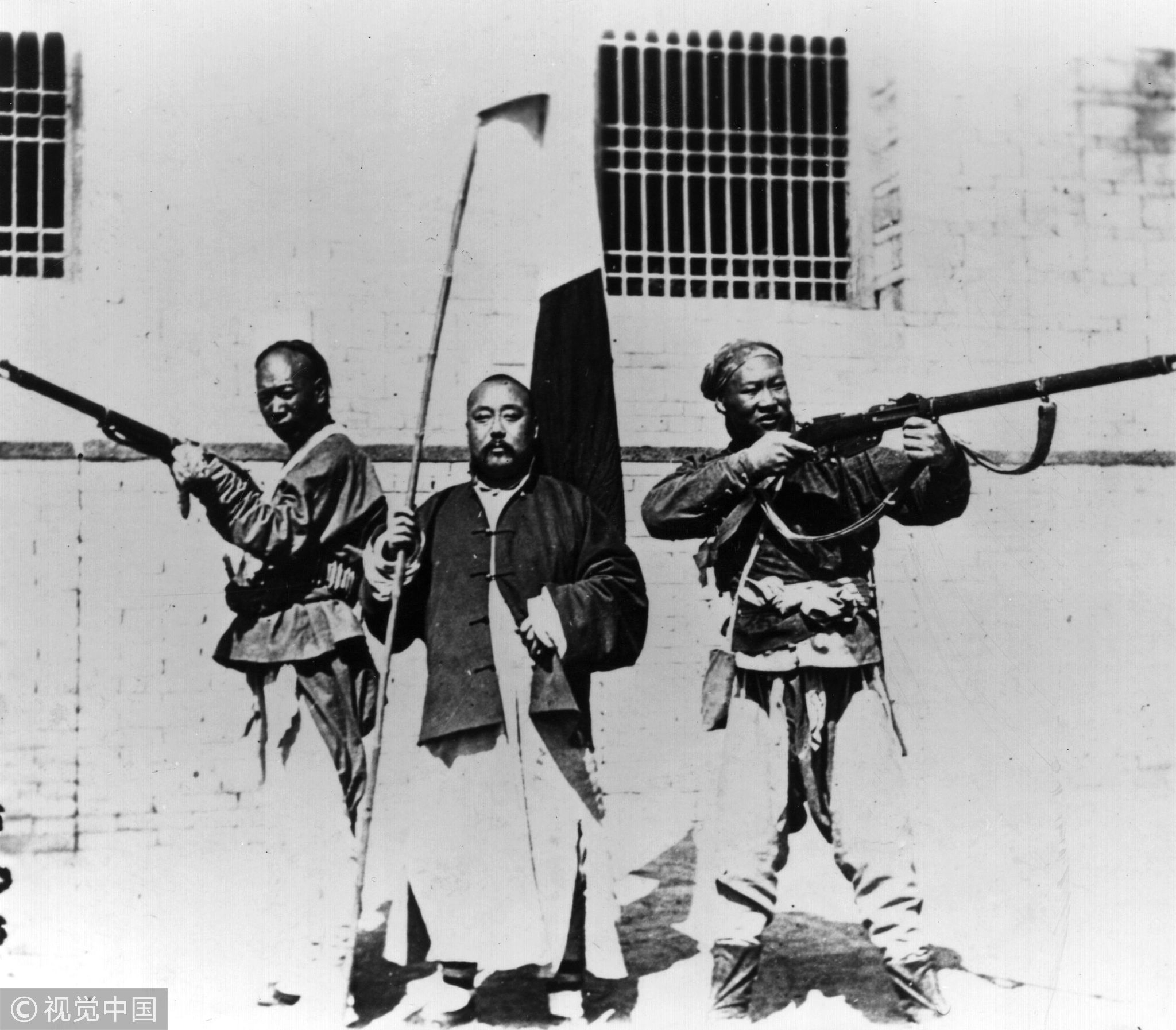 Roman Catholic priest Pater Schen and two Catholic soldiers prepare to defend themselves against the Boxers during the Boxer rebellion. /VCG Photo