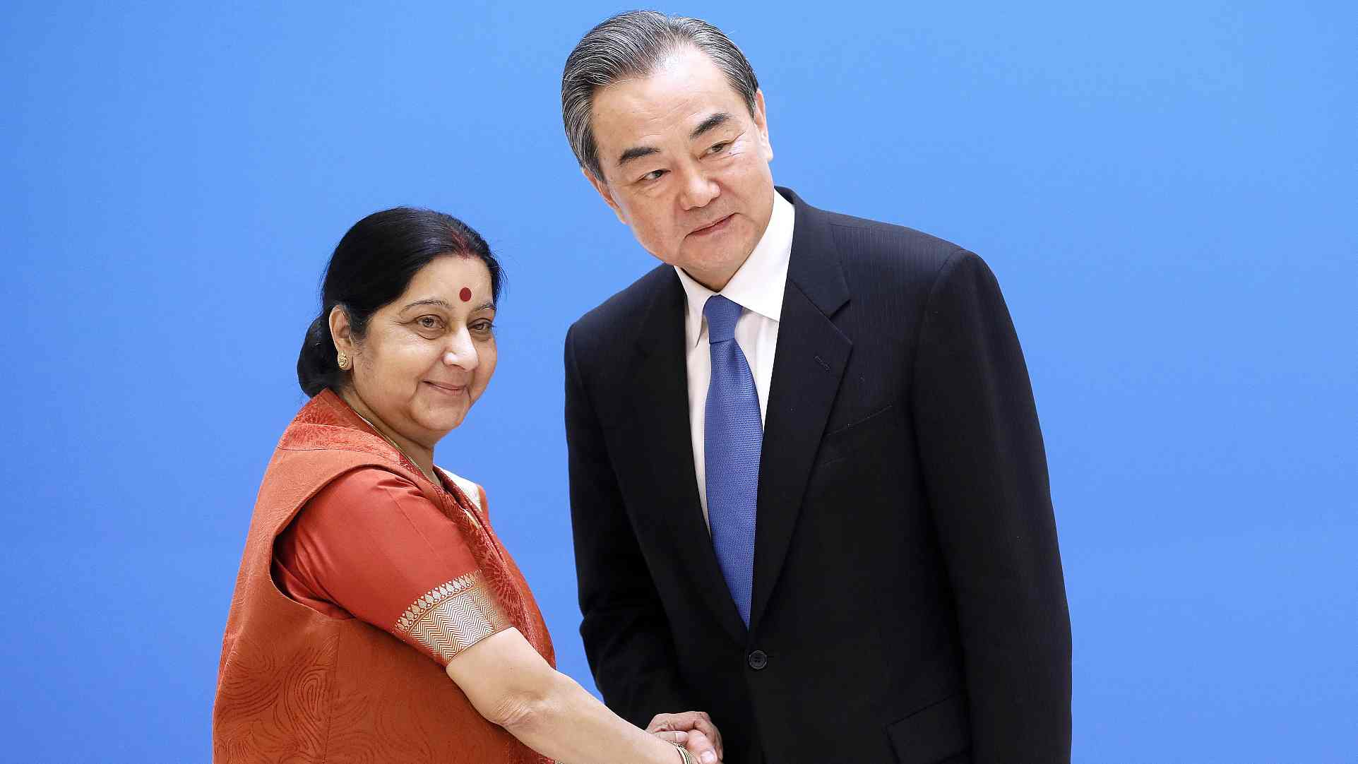 India's Foreign Minister Sushma Swaraj (L) shakes hands with her Chinese counterpart Wang Yi ahead of a meeting of foreign ministers of the SCO member states. /VCG Photo