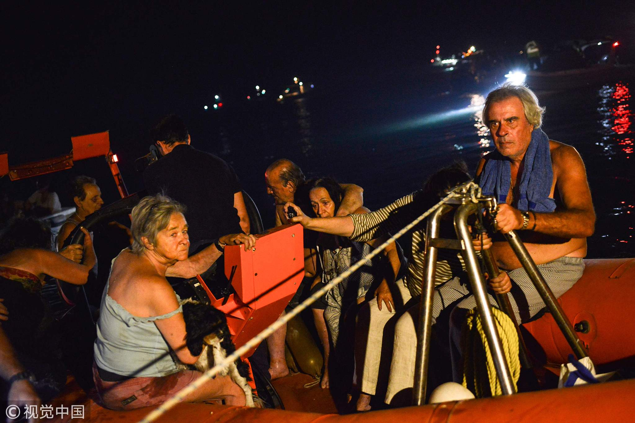 Rescuers and volunteers help local people evacuate the village of Mati during a wildfire near Athens, July 23, 2018. /VCG Photo