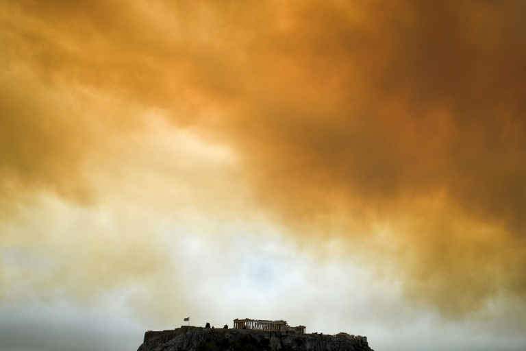 Smoke from the blazes blotted out the sun over the famed Parthenon temple in Athens, where some ministries closed in the afternoon due to the soaring heat.