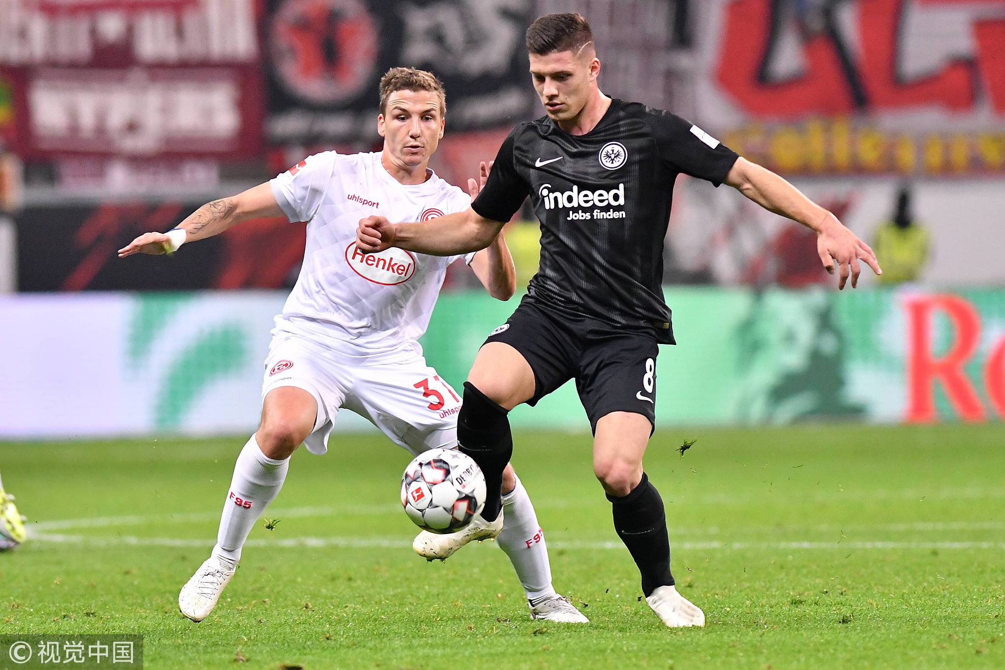 Luka Jovic of Frankfurt (R) scores five goals during the match against Dusseldorf in the Bundesliga, Commerzbank-Arena, Frankfurt, Germany, October 19, 2018. /VCG Photo