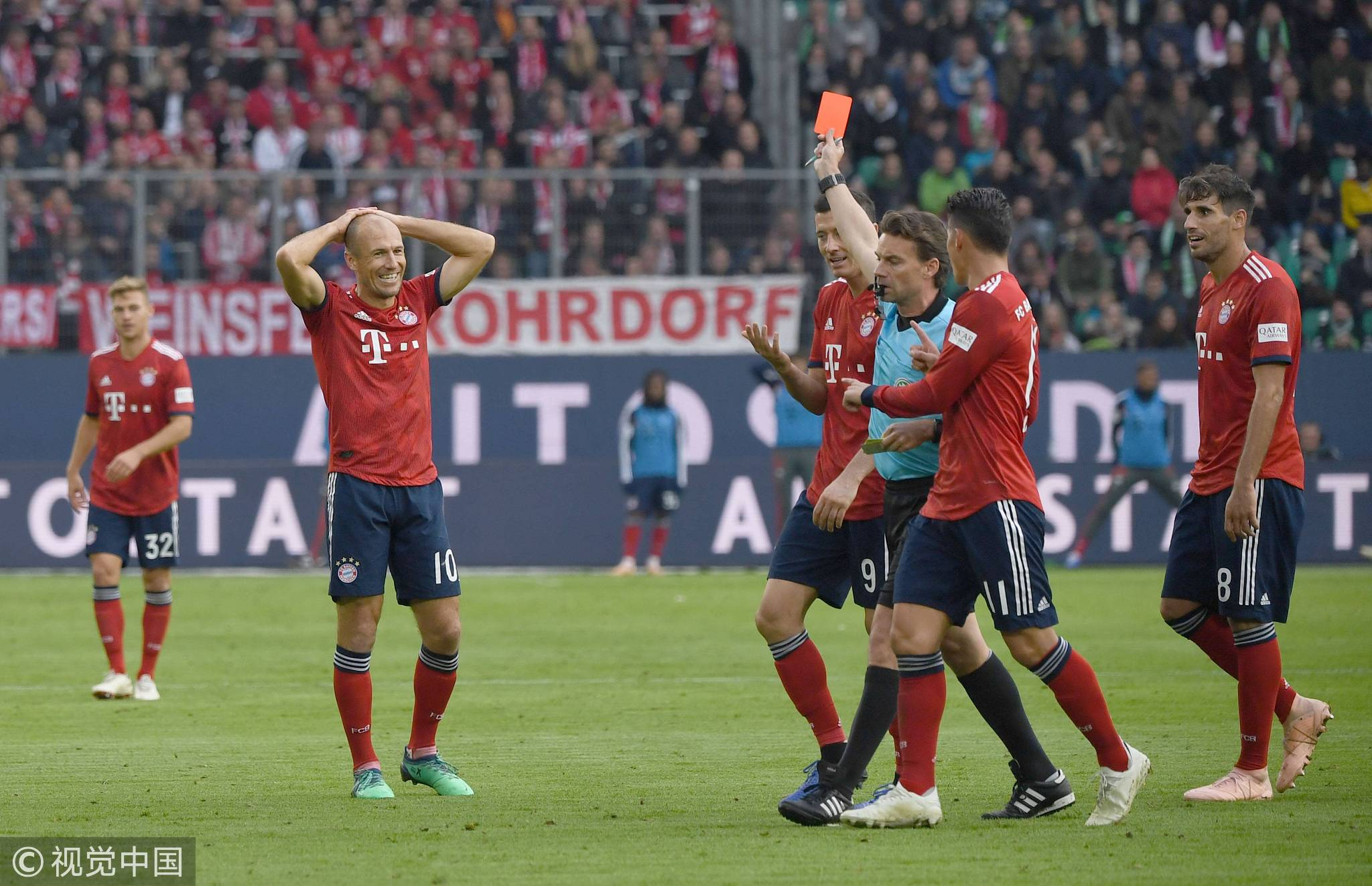 Arjen Robben of Bayern receives a red card during the match between Wolfsburg and Bayern in the Bundesliga, Volkswagen Arena, Wolfsburg, Germany, October 20, 2018. /VCG Photo